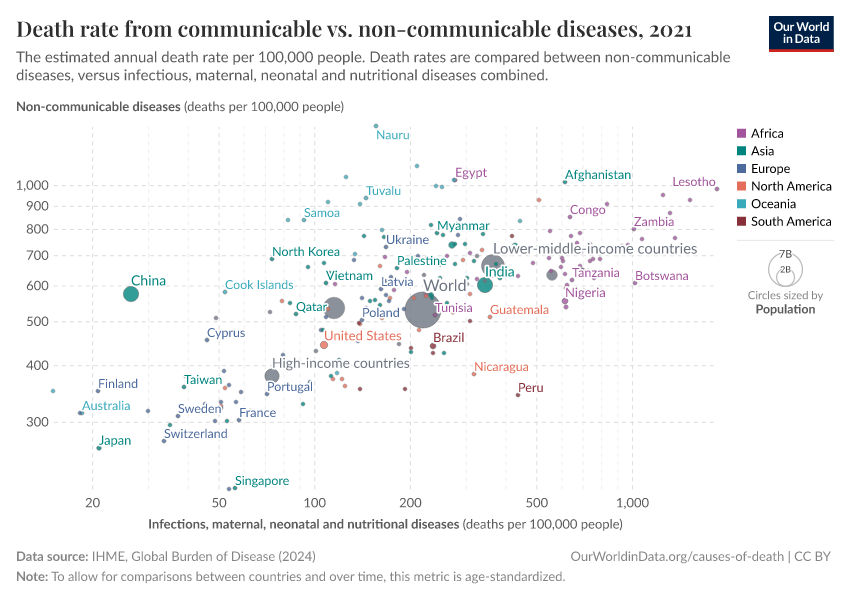 On this page, you will find global data and research on leading causes of death and how they can be prevented. This includes the number of people dying from each cause, their death rates, how they differ between age groups, and their trends over time.