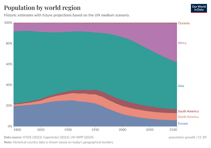 HYDE (2023); Gapminder (2022); UN WPP (2024) – with major processing by Our World in Data. “Population by world region” [dataset]. PBL Netherlands Environmental Assessment Agency, “History Database of the Global Environment 3.3”; Gapminder, “Population v7”; United Nations, “World Population Prospects”; Gapminder, “Systema Globalis” [original data]. Retrieved March 28, 2025 from https://tweak-data-page-header.owid.pages.dev/grapher/population-regions-with-projections