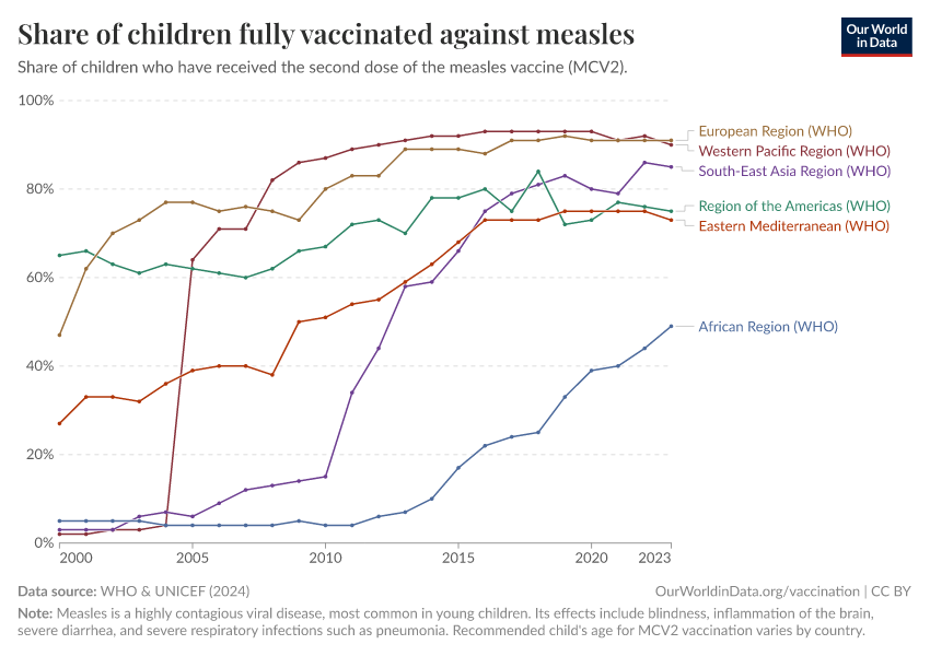 This has been a truly global effort, with more than 5 million children saved in every region, including over 50 million in Africa and 38 million in Southeast Asia. You can see the cumulative number of lives saved by WHO region in the chart below.